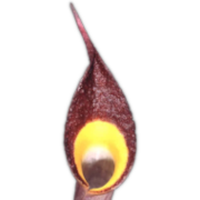 Cryptocoryne Xpurpurea Ridley nothovar. borneoensis N. Jacobsen, Bastmeijer & Y. Sasaki is new variety found in South Kalimantan. The leaf blade is cordate, brown purple, flat to somewhat bullate. The spathe is 10-20 cm long, the limb 3-6 cm long, ovate and long acuminate, somewhat rugose, shiny bright red, sometimes dark red; the collar/collar zone is distinct, somewhat narrow, dotted towards the opening.